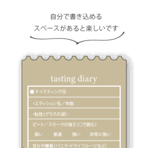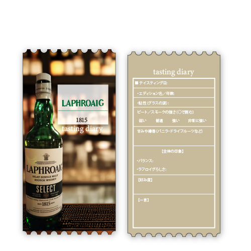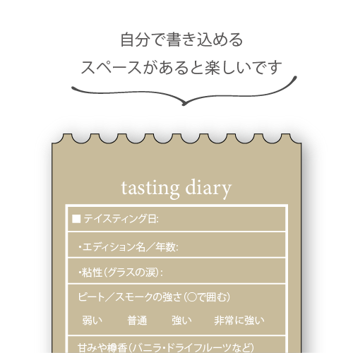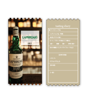 裏面には 飲んだバーの名前・日付・ピートや風味を書き込む欄を作りました。