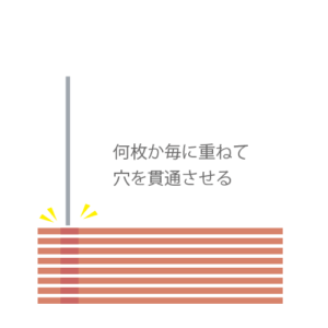 複数枚を重ね、棒状の工具を穴に当てて押し抜いていきます。