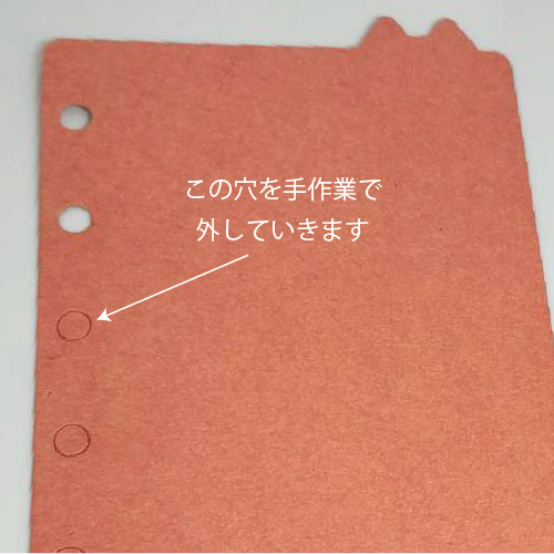 複数枚を重ね、棒状の工具を穴に当てて押し抜いていきます。